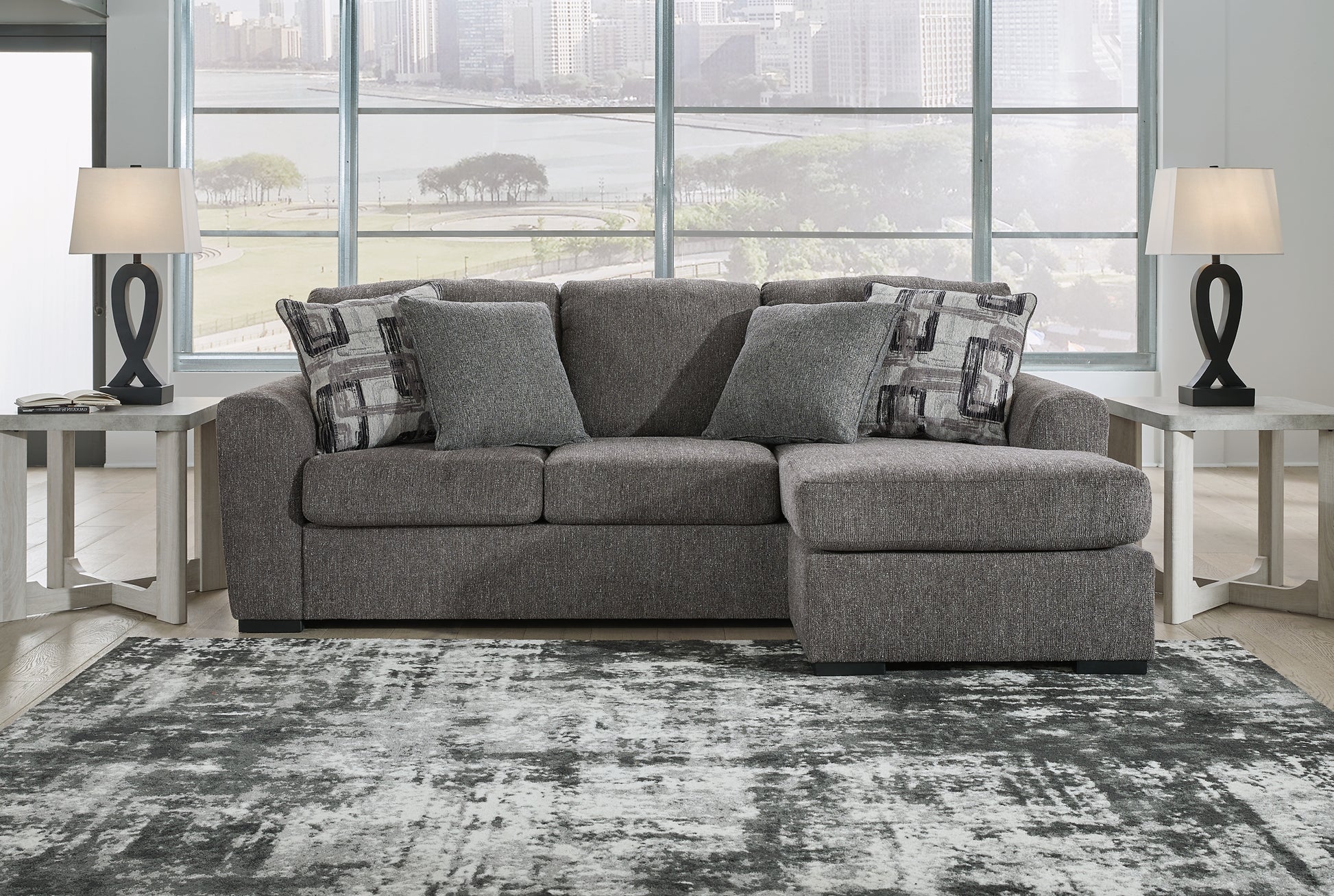 Details | Corner-blocked frame, Attached back and reversible seat cushions, Chaise can be positioned on either side (thanks to reversible seat cushion and movable ottoman), High-quality foam cushions wrapped in poly fiber, Accent pillows included, Pillows with soft polyfill, Polyester upholstery, Exposed feet with faux wood finish, Platform foundation system resists sagging 3x better than spring system after 20,000 testing cycles by providing more even support, Smooth platform foundation maintains tight, wrinkle-free look without dips or sags that can occur over time with sinuous spring foundations | |